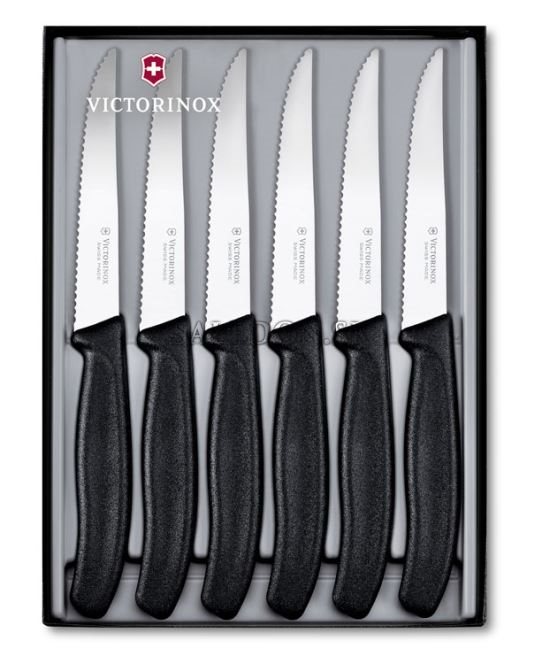 Súprava steakových nožov 6-dielna s polypropylénovými rukoväťami v darčekovom balení. Súprava pozostáva z 6 ks rovnakých steakových nožov s dĺžkou zúbkovanej čepele 11 cm. Nože sú vhodné do umývačky.